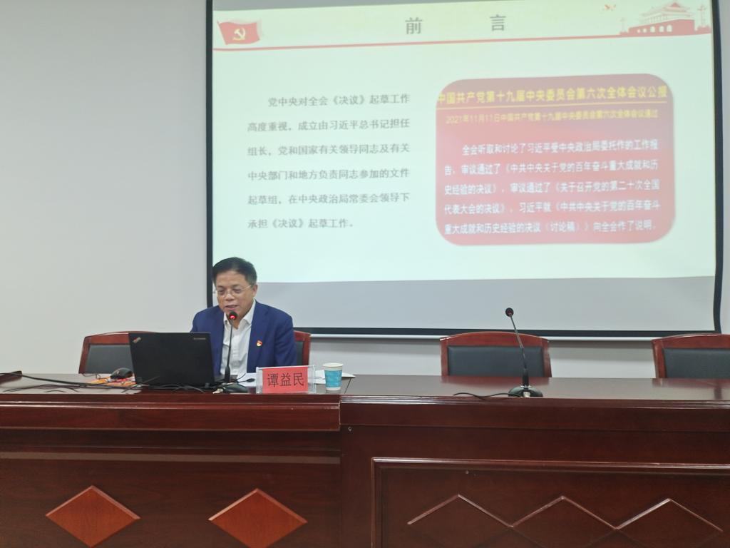 谭益民在宣讲中紧紧围绕学习贯彻党的十九届六中全会精神和全会通过的《决议》,从深刻把握召开党的十九届六中全会、作出新的历史《决议》的重大意义,深刻把握党百年奋斗的初心使命和重大成就,深刻把握中国特色社会主义新时代的历史性成就和历史性变革,深刻把握党百年奋斗的历史意义和历史经验等方面进行了系统阐述和深入解读。