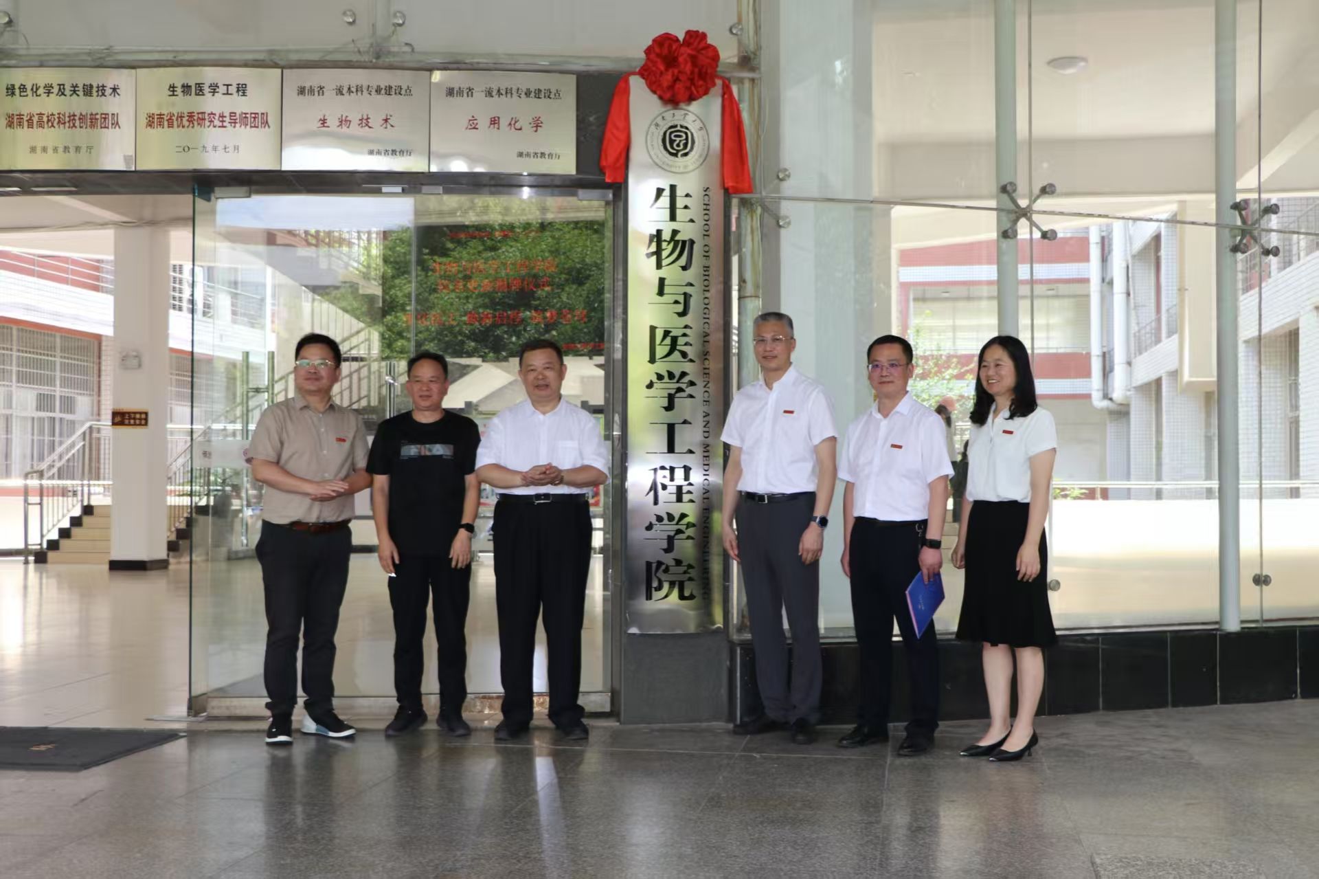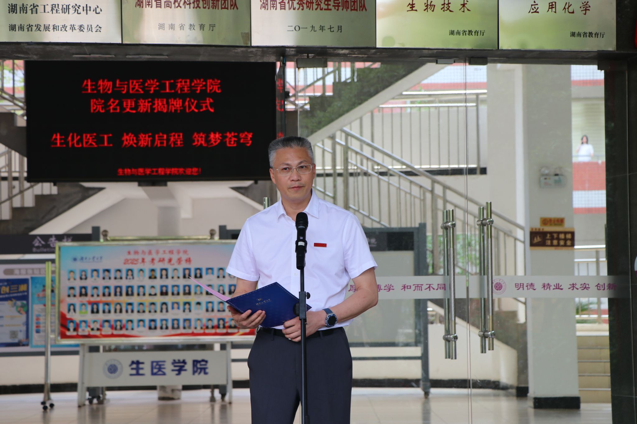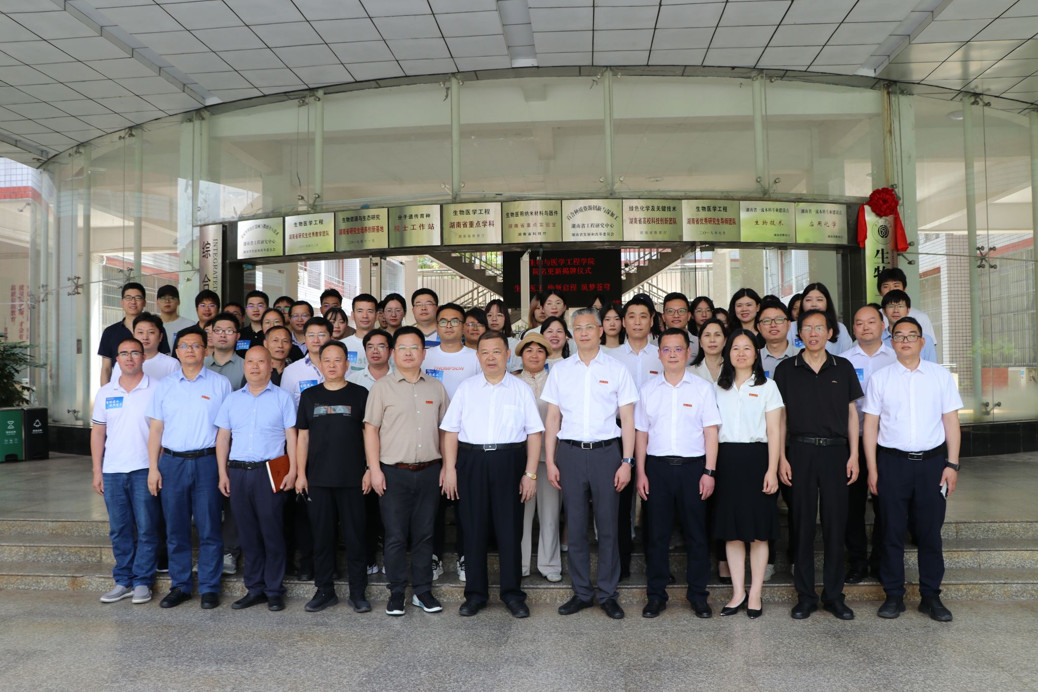 2025年5月30日上午,生物与医学工程学院在崇仁楼前坪举行更名揭牌仪式。校党委书记刘望、校长蒋昌波、副校长何杰出席仪式,相关职能部门、学院党政负责人及师生代表共同见证这一历史性时刻。仪式由何杰主持。