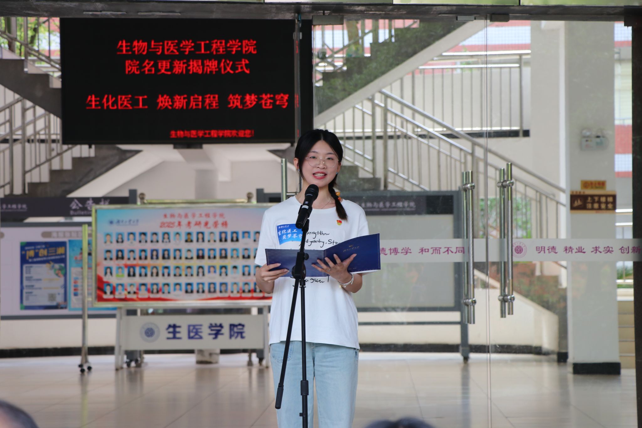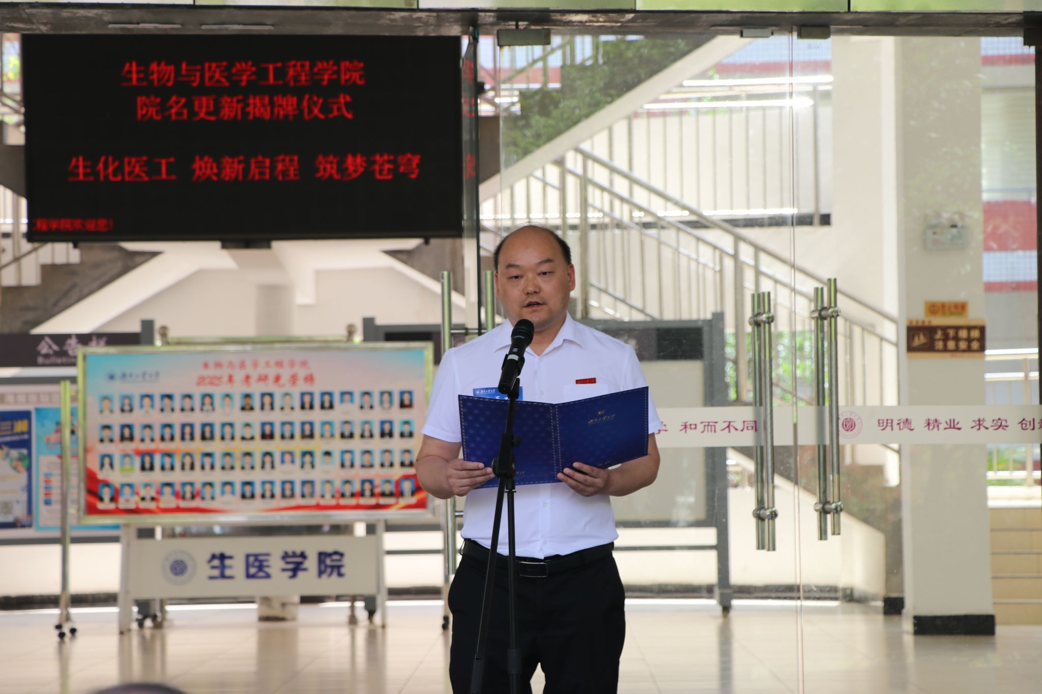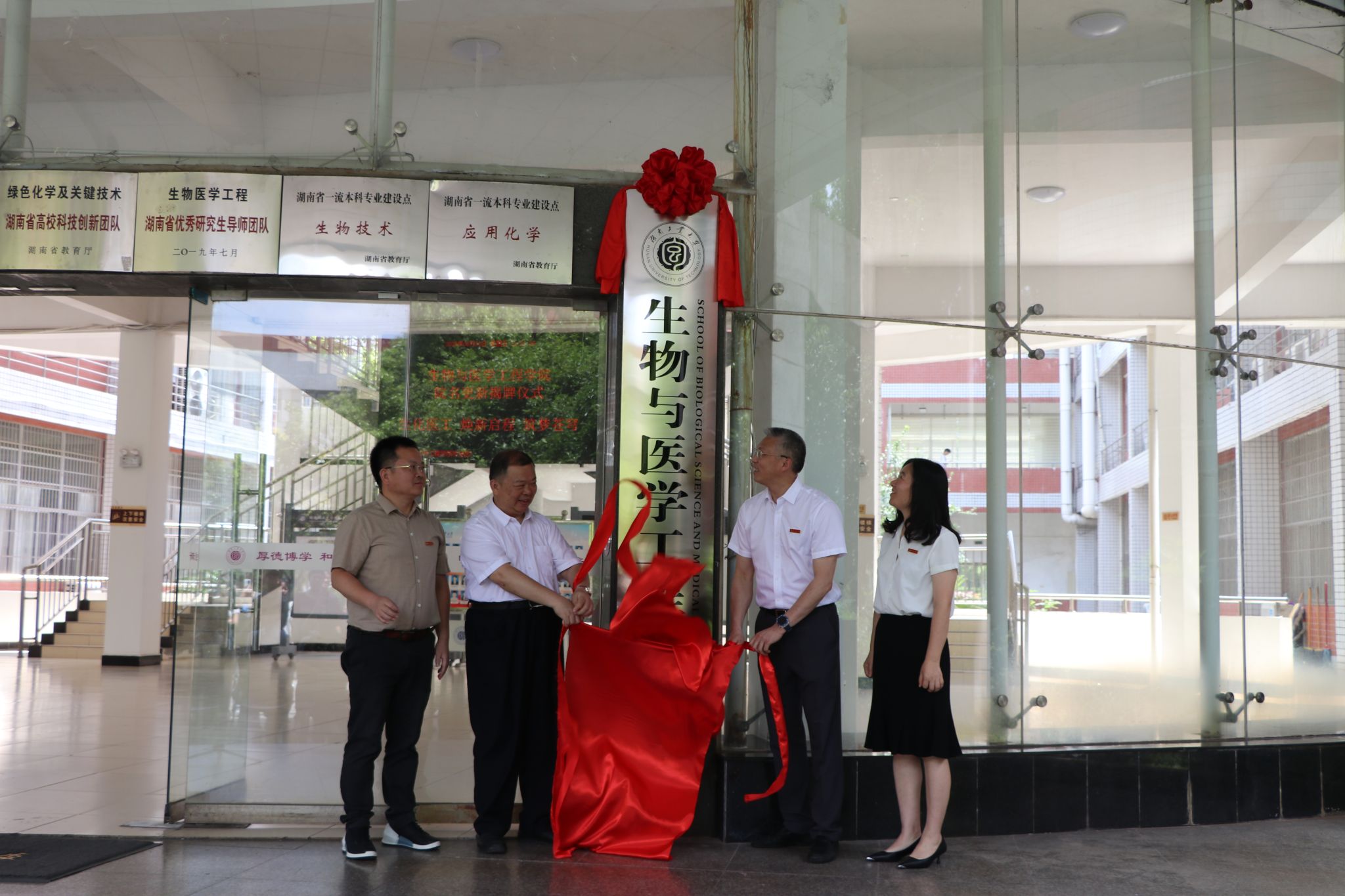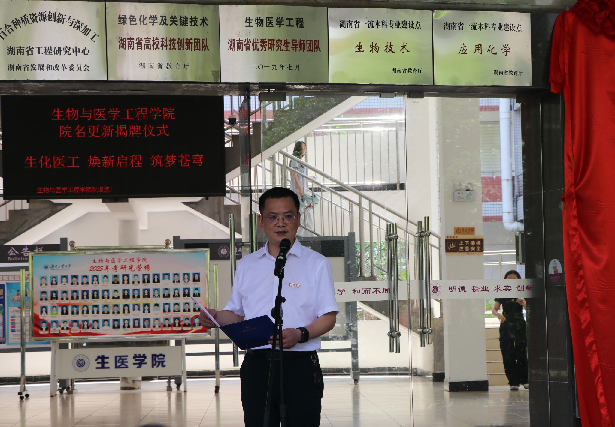 2025年5月30日上午,生物与医学工程学院在崇仁楼前坪举行更名揭牌仪式。校党委书记刘望、校长蒋昌波、副校长何杰出席仪式,相关职能部门、学院党政负责人及师生代表共同见证这一历史性时刻。仪式由何杰主持。