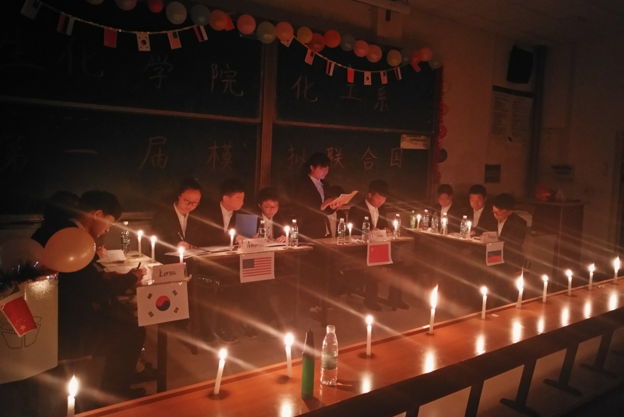最后,我院化工系积极创新,带来了一场独具特色的辩论赛--模拟联合国。与普通辩论赛不同,这是一个浪漫的烛光赛场。尽管灯光不足,但辩手与观众们却未因此而放弃或离去。在微弱的灯火中上演一场激烈的口舌之战。