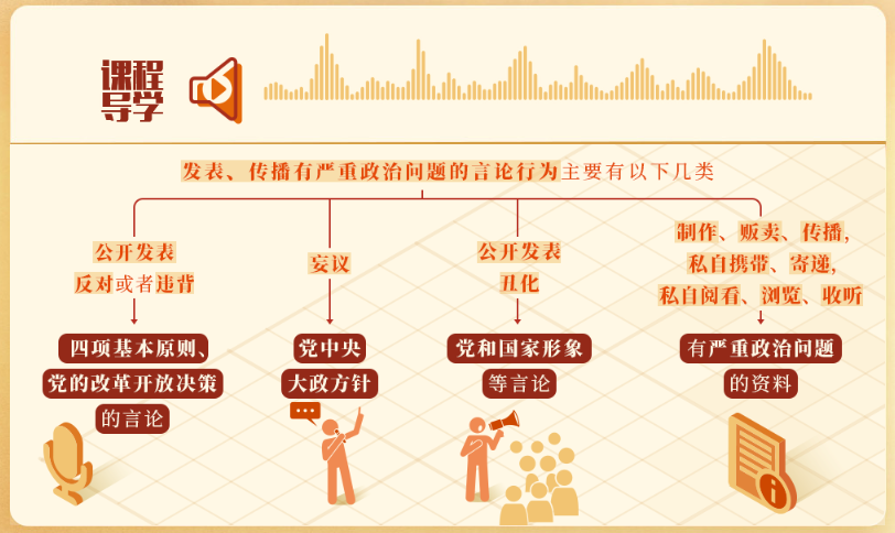 《中国共产党纪律处分条例》第五十条、第五十一条、第五十二条对发表、传播有严重政治问题的言论行为列出负面清单,目的是严格规范党员言论,以严格的纪律处分规定保障四项基本原则、改革开放决策、党中央大政方针贯彻落实,维护党和国家形象,维护党和国家领导人威信,维护英雄模范形象,坚决反对歪曲党的历史、中华人民共和国历史、人民军队历史的行为,维护党的团结和统一。发表、传播有严重政治问题的言论行为主要有以下几类: