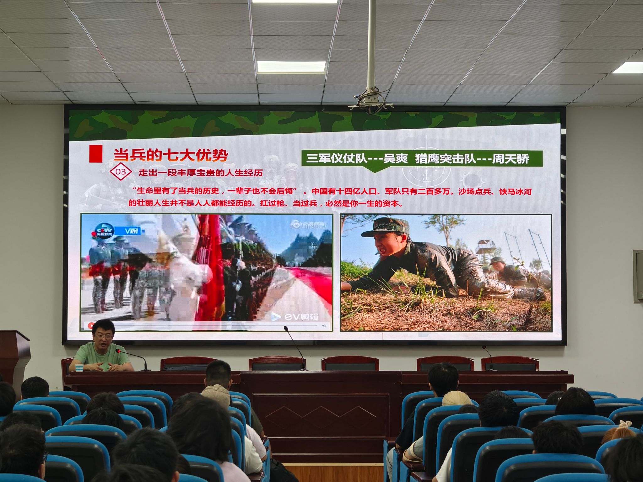 在“征兵工作”宣传环节,言老师为同学们阐述参军入伍的优势:强健体魄与精气神、结识同甘共苦的战友情谊、拥有一段宝贵的人生经历、拥有一份社会认可的工作履历等等。言老师还对学校退伍学生转专业、保研加分和毕业生考研等优待政策进行了解读,并对即将组织开展下半年征兵体格初检和政治考核初考安排进行说明。宣讲会更加激发出同学们的参军热情,也使同学们更加坚定将参军作为自己人生发展的选择和目标。