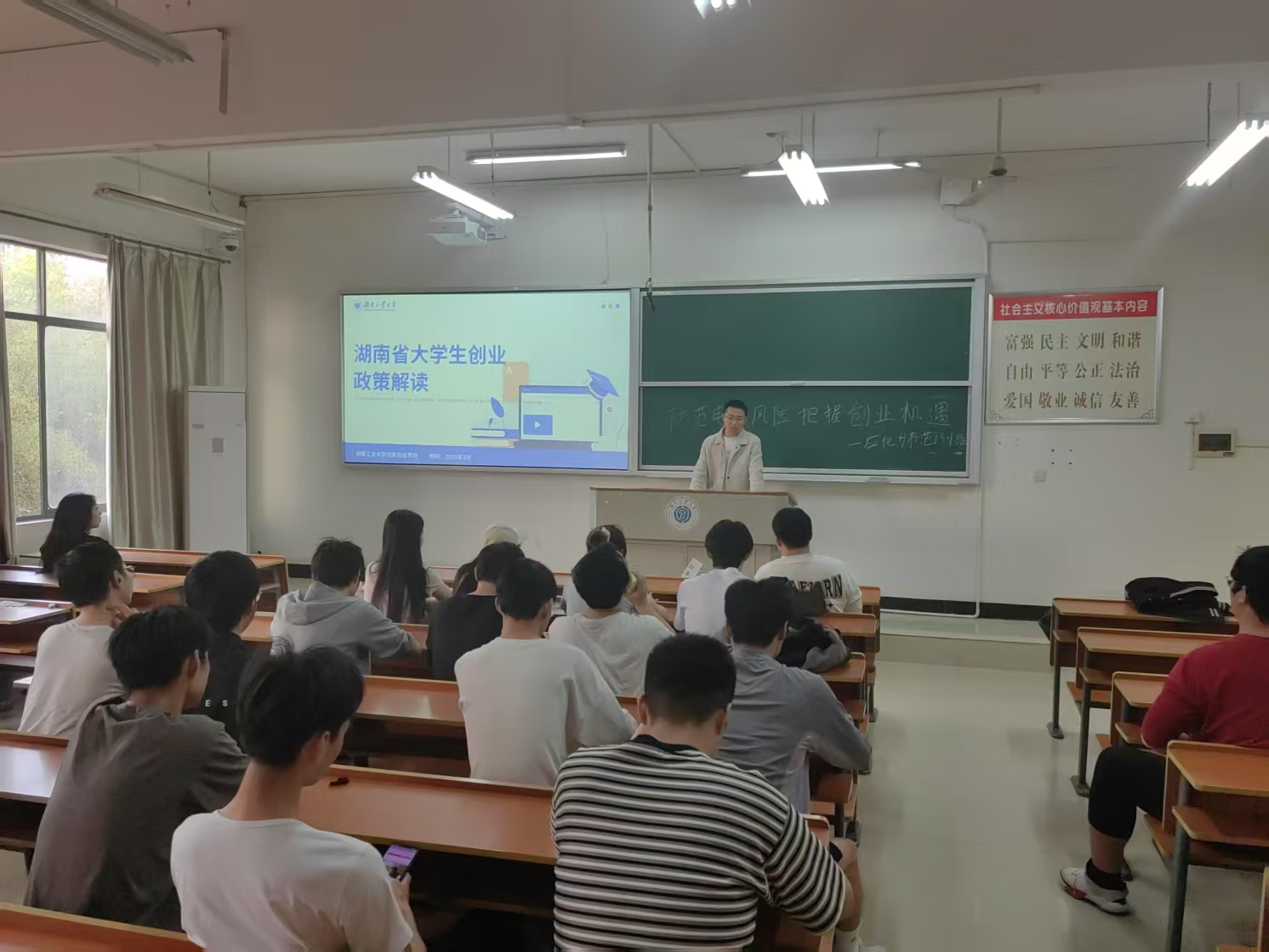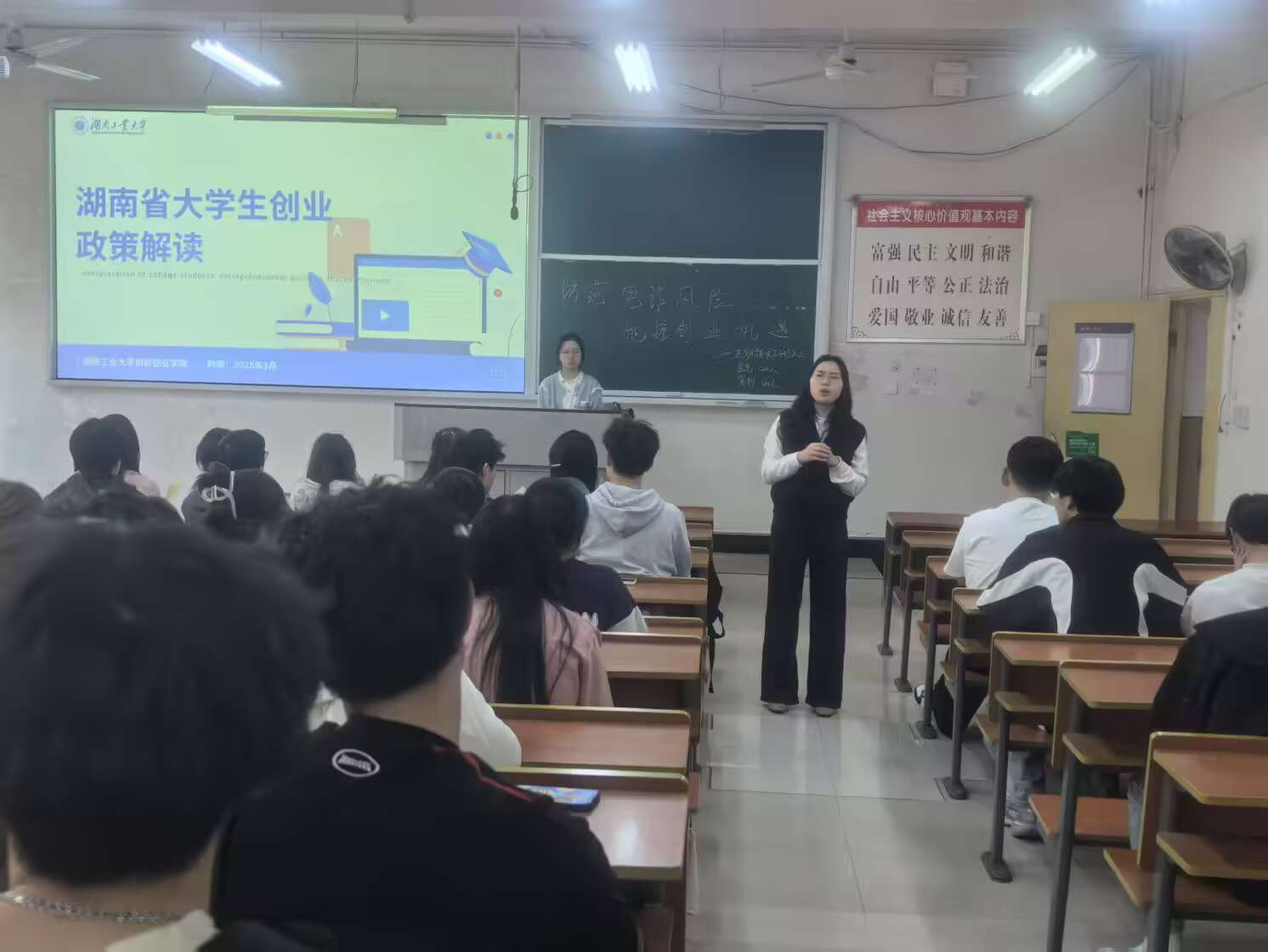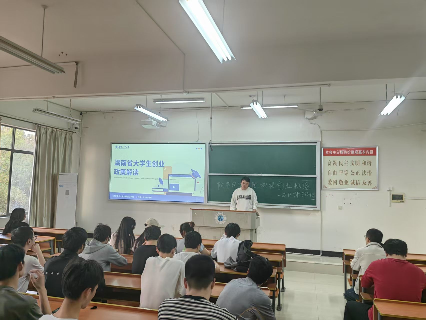 班会聚焦《湖南省大力支持大学生创业若干政策措施》及《湖南省大学生创业投资基金简介》核心内容,各班级通过“专人领学+多媒体展示”形式,对“七个一”政策进行深度剖析。各班班主任结合PPT、视频等资源,详细解读“一站式服务”“一揽子资金支持”等政策亮点,并梳理创业基金申请流程与扶持细则,帮助学生全面了解政策红利,打通信息壁垒。
