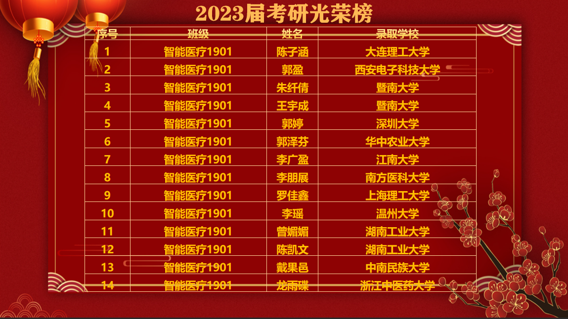 此外,还有同学们最关心的考研率,本专业2019级共有37名同学,此次考研有14名同学成功上岸,其中陈子涵学姐被大连理工大学录取,另13名学长学姐分别被西安电子科大,暨南大学,深圳大学等名校录取,考研率达37.84%。