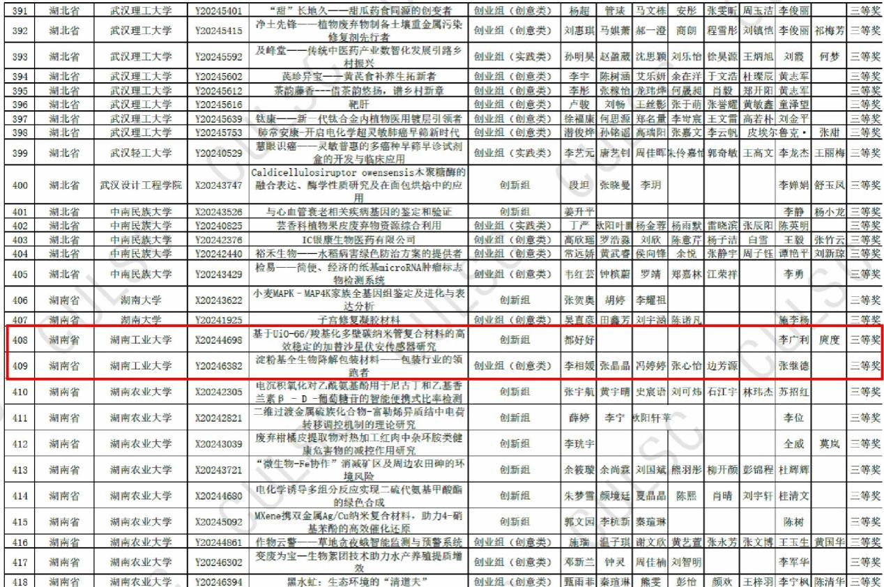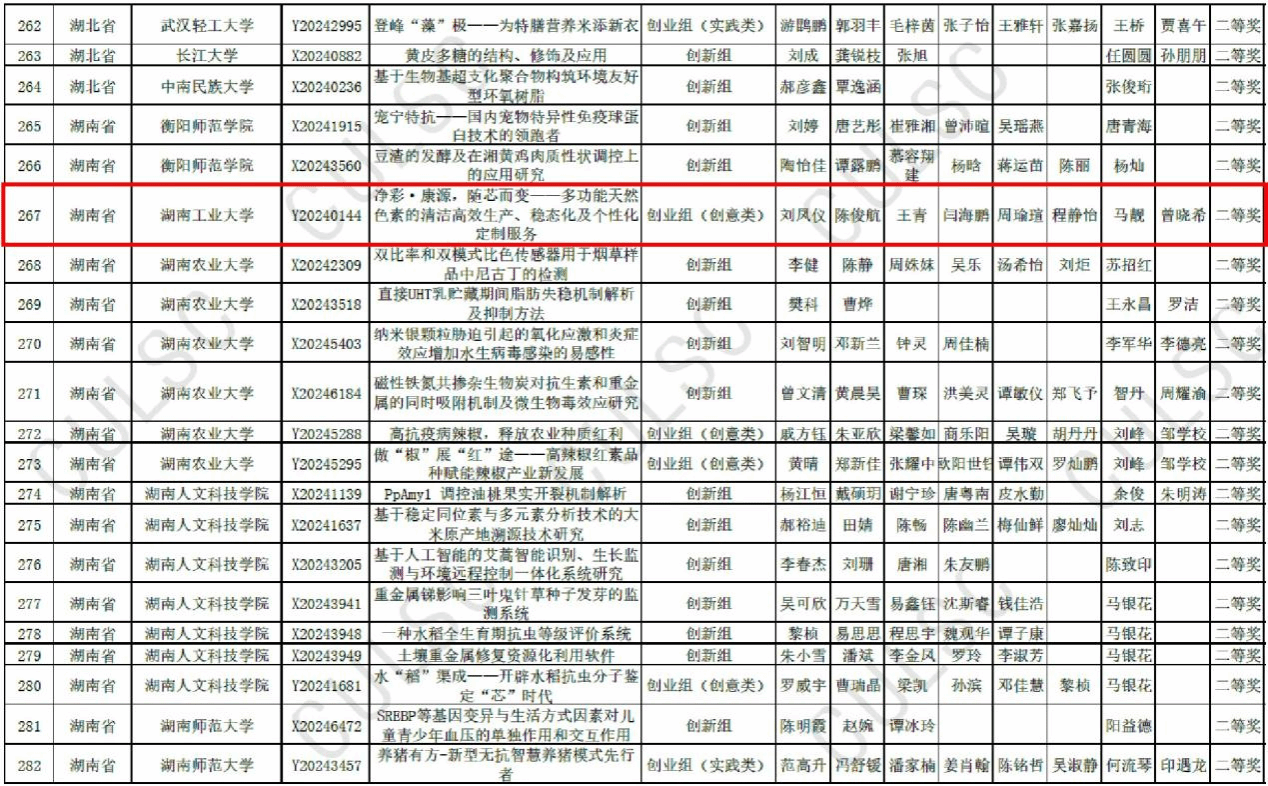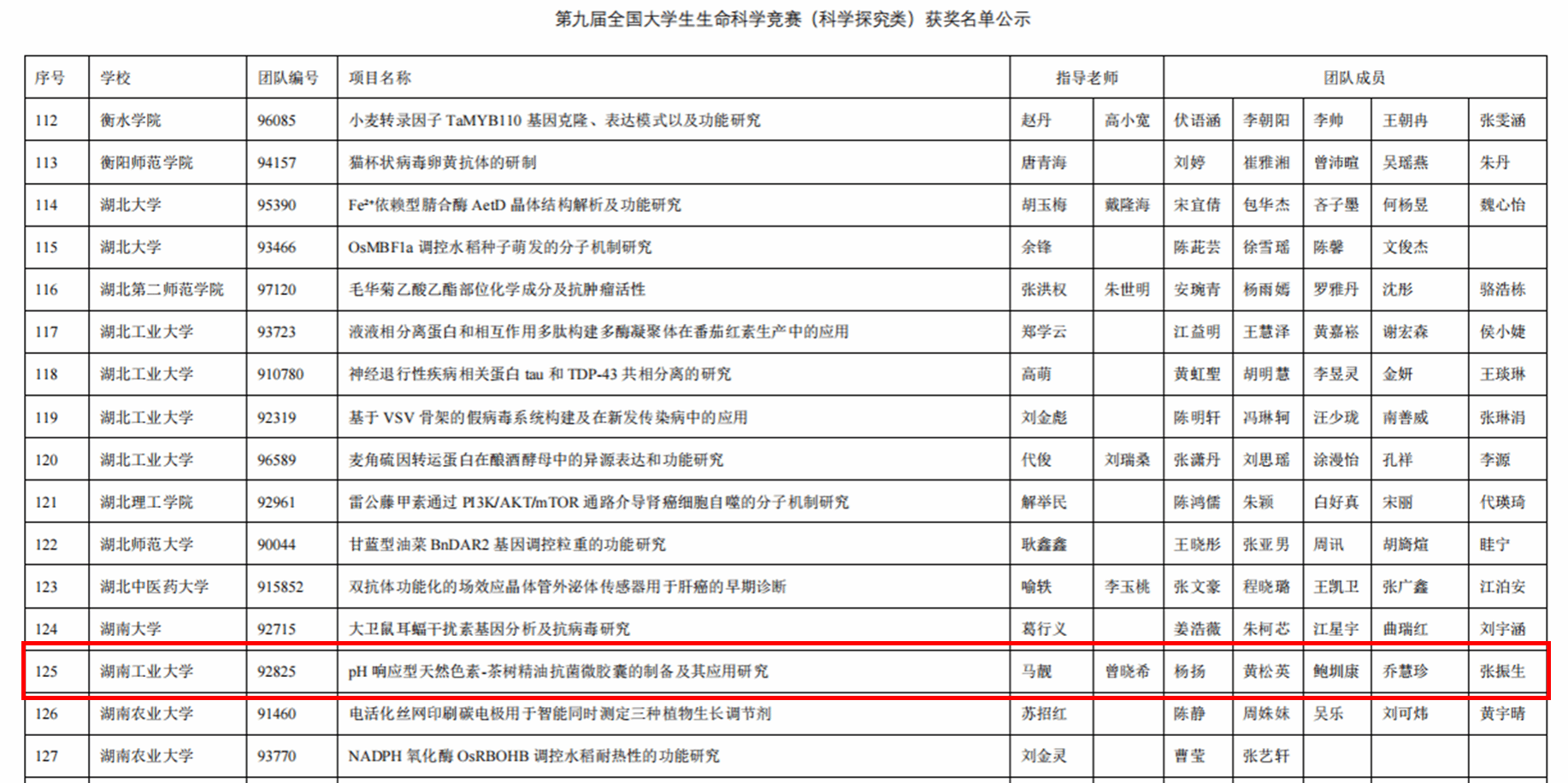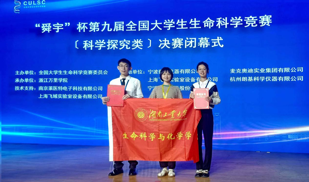 2024年7月23日,“舜宇”杯第九届全国大学生生命科学竞赛(科学探究类)全国总决赛圆满落幕,我院本科生团队在本届竞赛中共获得国家级一等奖1项、国家三等奖1项和省级三等奖1项。其中,我院本科生杨扬、黄松英、鲍圳康、乔慧珍、张振生(指导教师:马靓、曾晓希)的科学探究类项目《pH响应型天然色素-茶树精油抗菌微胶囊的制备及其应用研究》以湖南省一等奖的好成绩晋级全国总决赛,并最终斩获全国一等奖,取得了我校在该项赛事中的历史最好成绩。