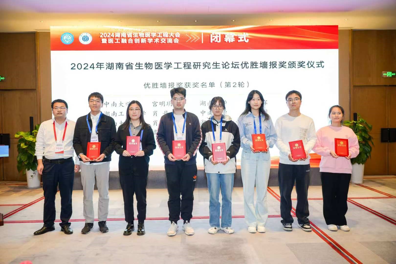 本次汇报主要包括了口头汇报与墙报展示,在口头汇报中,生物医学工程专业22级朱琳与24级吴灿标以流利的表达,新颖的科研成果在湖南省生物医学工程研究生论坛口头报告中荣获口头汇报一等奖。