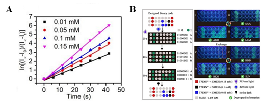 图2.(a)SMEH- TPE4N4+在485 nm处的发射强度随SMEH浓度的增加而变化的一级动力学拟合结果;(b)不同荧光变化率进行多级二值编码信息加密和自擦的示意图