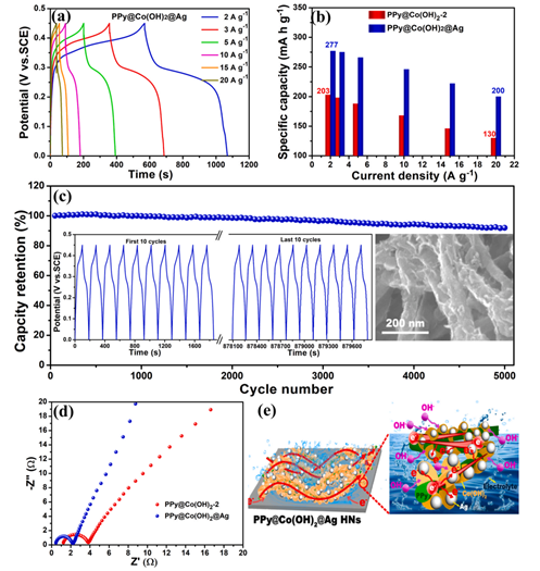 图3. PPy@Co(OH)2 @Ag电极(a)GCD曲线; (b)PPy@Co(OH)2-2和PPy@Co(OH)2 @Ag电极的速率能力、(c)循环稳定性、(d)Nyquist图; (e)PPy@Co(OH)2 @Ag电极的电荷存储示意图。图8(c)中的插图是PPy@Co(OH)2 @Ag电极第一次和最后10次循环的GCD曲线和SEM图像(OH)2 @Ag电极分别循环后。