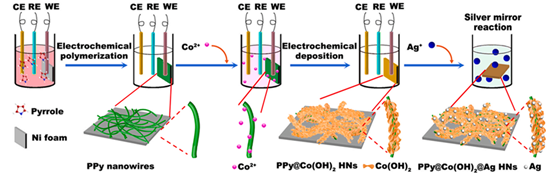 图1. 在Ni泡沫上直接生长修饰Ag NPs修饰的PPy@Co(OH) 2 HNs的合成示意图。