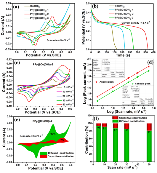 图2. 不同电极在5mv s−1 (a)下的CV曲线和(b)2mv g−1下的GCD曲线;PPy@Co(OH)2-2电极的(b)CV曲线和(d)log(i) vs log(v);5 mV s−1 (e)下PPy@Co(OH)2-2电极的扩散和电容贡献;(f)不同扫描速率下PPy@Co(OH)2-2电极的电荷存储贡献。