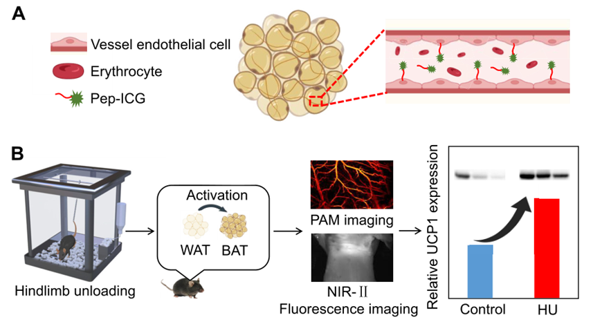 图1. (A)使用分子探针靶向BAT血管;(B)HU处理后的BAT激活及其生理变化。