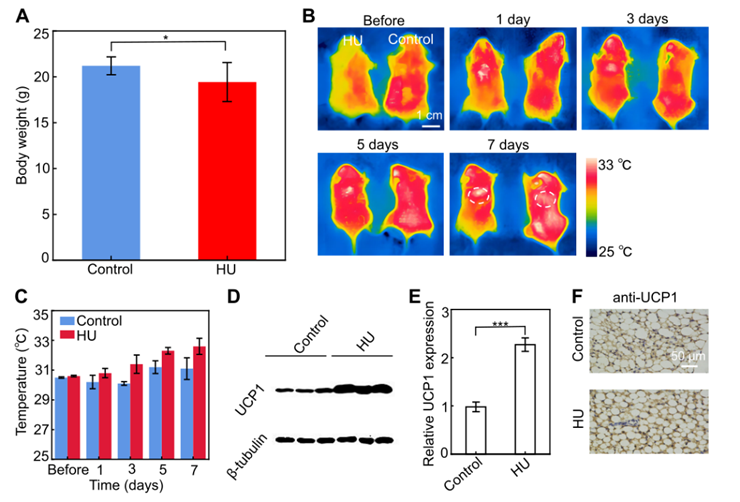 其次,通过红外热成像技术,研究者发现HU处理的小鼠在BAT区域的表面温度显著高于对照组,这表明了BAT产热增加。此外,通过免疫印迹和免疫组化染色,研究者发现HU处理显著上调了UCP1蛋白的表达,这可能是导致体重下降的关键原因。