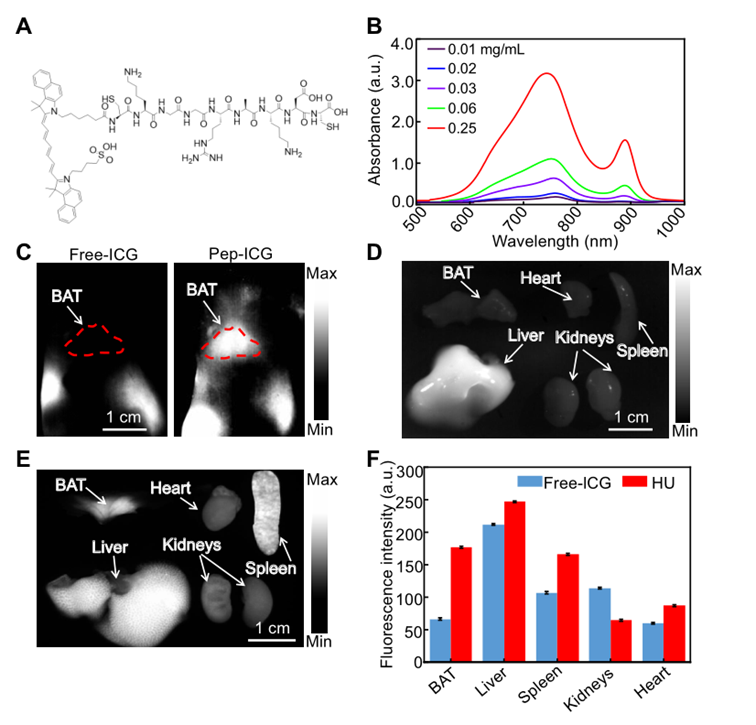 图3. 探针Pep- ICG的特异性靶向。探针Pep-ICG的结构式和吸收曲线(A、B);HU处理后小鼠BAT的NIR- II荧光成像(C);游离ICG组(D)和Pep-ICG组(E)离体组织(BAT、心脏、肝脏、脾脏和肾脏)的NIR-II荧光成像。F:离体组织荧光强度的定量比较。