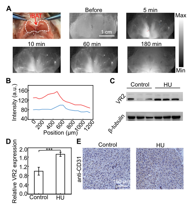 图4. (A)BAT的NIR-II荧光成像; (B)BAT区域血管强度分布图; (C、D)对照组和HU组小鼠BAT裂解液免疫印迹; (E)对照组和HU小鼠BAT CD31免疫组化。