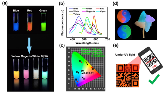 研究人员通过使用一个简单的一锅法设计和制造了MOF NP交联的明胶/pHEAA纳米复合双网络水凝胶。在水凝胶中存在乙烯基官能化沸石咪唑骨架-8 MOF NPs不仅提供了与聚合物网络的多种化学和物理相互作用以增强其机械性能,(抗拉强度为2.4 MPa,断裂应变为14,断裂能为14.10 MJ/m3),而且紫外线触发的多荧光变化范围从原色红-绿色-蓝色到二级黄色、洋红、青色、和白色颜色。更重要的是,可以进一步制造MOF/明胶/pHEAA水凝胶以具有用于QR码或潜在信息存储的不同的荧光响应图案。