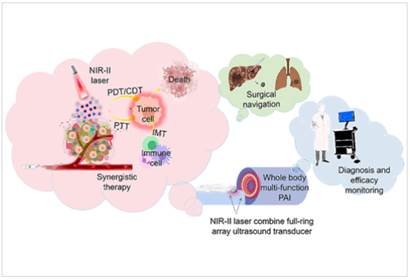 作者总结了用于癌症诊断和治疗的PAI系统的最新进展的主要特点和技术优势。对于PACT系统,外源性造影剂可以在活体动物的深层组织中以二维(2D)或三维的高分辨率可视化。为了实现高速和高时空分辨率,还开发了3D-PACT系统。外源性PA造影剂的主动靶向策略在分子水平上出现,用于基于靶向配体或抗体的早期癌症成像,基于此,作者总结了一些基于常见肿瘤生物标志物的PA探针。在涉及造影剂和药物分子的医疗领域的一体化平台,通过PAI提供前所未有的治疗效果,具有高靶向能力和实时监测,使PAI成为临床前研究的多功能工具,作者总结了近年来在NIR-II中以PAI为指导,综合平台辅助的肿瘤治疗策略。