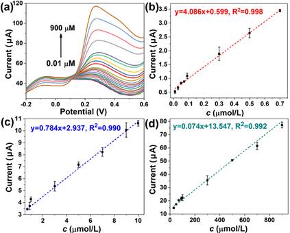 图2不同浓度DA对α-Fe2O3/rGO/GCE的典型LSVs,三个浓度范围内呈线性关系(所有数据均进行了三次检测,并采用标准差法对数据进行了评价)。