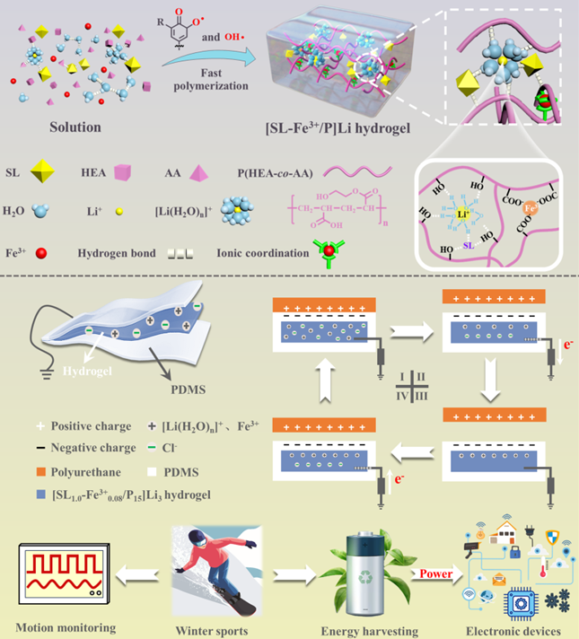 导电水凝胶因其优异的柔韧性和灵敏度,在可穿戴电子设备领域展现出巨大潜力。然而,传统水凝胶的凝胶化过程耗时且能耗高,且在低温下电学性能下降,严重限制了其实际应用。betway必威中国许建雄教授提出了一种基于木质素-Fe3+自催化体系的快速制备方法,成功开发出一种坚韧、抗冻、导电水凝胶([SL-Fe3+/P]Li),并将其应用于摩擦电纳米发电机(TENG),使其能够在极端低温环境中高效工作。相关成果“Rapid preparation of tough, anti-freezing, and conductive hydrogel via lignin-Fe3+ self-catalytic system for extreme environment-resistant triboelectric nanogenerator”发表在2025年2月的《化学工程杂志》(Chemical Engineering Journal)期刊上。论文通讯作者为许建雄教授、李娜教授和许利剑教授,第一作者为余茂林讲师。