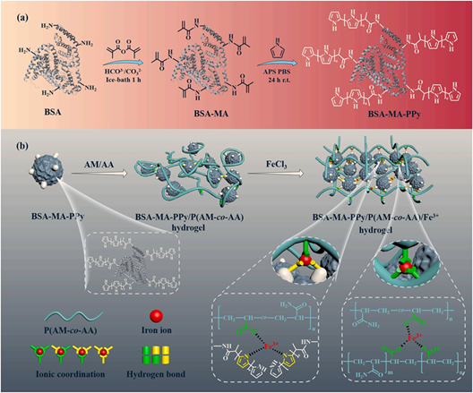 (a)BSA-MA和BSA-MA-PPy的合成路线。(b)BSA-MA-PPy/P(AM-co-AA)/Fe3+凝胶的制备。
