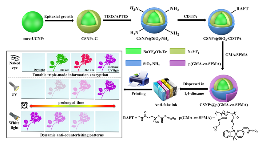 利用PUCNPs的光学特性,作者探究了它们在复杂信息加密和动态防伪模式中的潜在应用。通过喷墨打印技术,可以将这些纳米粒子用于构建多色信息加密和动态防伪图案。同时还对PUCNPs的形态、荧光特性以及它们在不同刺激下的光响应性能进行了详细的测试和表征。结果证明PUCNPs作为一种智能材料在信息加密和防伪领域的应用潜力,并指出了其在光可重写纸张、复杂防伪和安全印刷等方面的应用前景。
