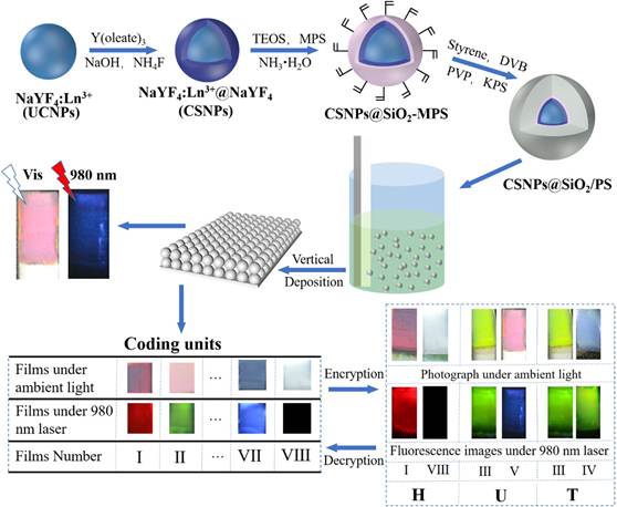 基于CSNPs@SiO2/PS复合微球合成UCPC膜构建双模防伪码示意图。