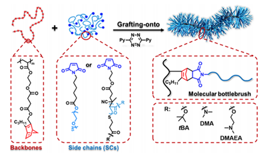分子瓶刷具有密集的接枝侧链,几何形状稳定,尺寸在数十到数百纳米间可调,是一种重要的单分子纳米材料。当瓶刷接枝密度足够高时,其长度主要取决于主链的聚合度,而直径主要取决于侧链的尺寸和接枝密度。分子瓶刷形态的调节可以简单地通过调整其长度与直径来实现,例如,当长度与直径相当时,瓶刷将呈球状;长度略大于直径时,瓶刷将呈棒状;长度远大于直径时,瓶刷将呈蠕虫状。本工作使用的点击反应由Read de Alaniz等人在2019年报道。NBD在四嗪催化下原位释放高反应性的NBD,然后NBD与Mal基团发生D-A反应,实现高效的连接。分子瓶刷的主链为含有NBD重复基团的聚(2-羟丙烯酸乙酯)(PHEA,poly(2-hydroxyethyl acrylate)),侧链为通过可逆加成−片段链转移(RAFT,reversible addition−fragmentation chain transfer)聚合和聚合后修饰制备的Mal封端的聚乙二醇和聚丙烯酸丁酯等。
