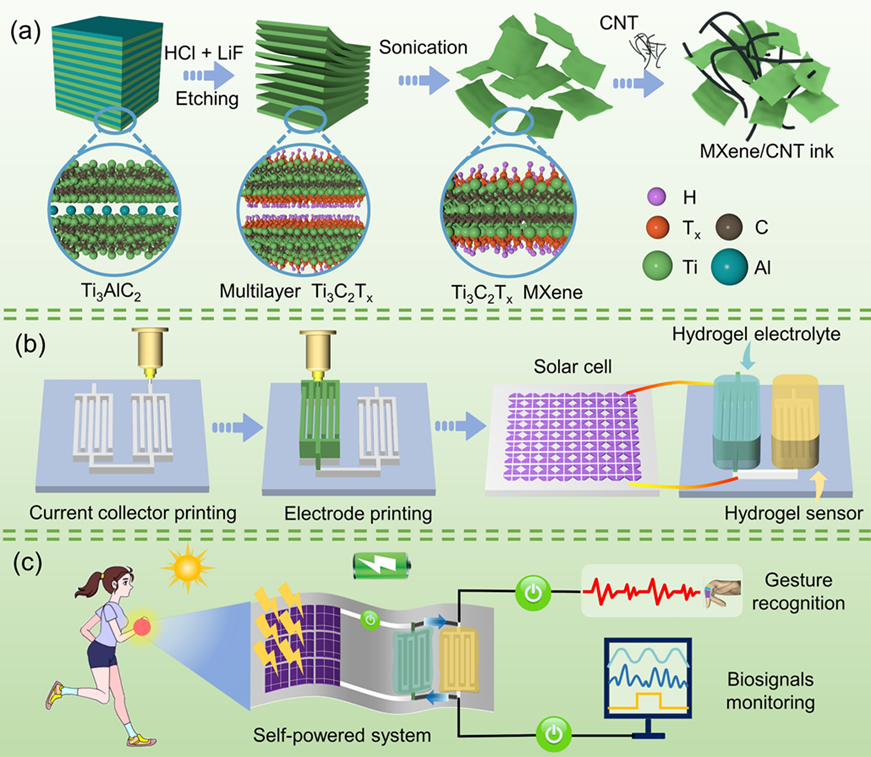 随着智能电子和物联网时代的到来,微型储能设备在柔性可穿戴健康监测器件、机器人和植入式医疗传感器等领域逐渐发挥重要作用。其中,微型超级电容器(MSCs)是一类电极在同一平面内呈周期性叉指状图案排列的储能设备,具有功率密度高、循环寿命长和电子/离子扩散路径可控等优势。3D打印技术可以实现电容器电极的几何形状精确定制,获得高度集成的MSCs储能器件,较大程度节约成本。然而,MSCs的规模化应用仍严重受限于可适用3D打印的高性能可印刷电极材料墨水。Ti3C2Tx-MXene在水溶剂中具有的良好的分散性和优异的物理化学性质,可作为3D打印墨水制备MSCs。然而,寻找不含添加剂的环保水性Ti3C2Tx-MXene基油墨,并防止MXene纳米片在高浓度油墨中严重堆叠团聚,仍然是重大挑战。针对该问题,必威官方首页官网材料与先进制造学院李娜教授课题组联合必威官方首页官网生物与医学工程学院许建雄教授,温州大学王正军博士开发了一种无添加剂、高度可印刷、粘度可调且环保的MXene/碳纳米管(CNT)复合墨水。优化后的复合油墨可以通过3D打印技术在柔性基材上迅速构筑叉指结构微电极,展现出优异的集成灵活性。相关工作以“Additive-Free Ti3C2Tx MXene/Carbon Nanotube Aqueous Inks Enable Energy Density Enriched 3D-Printed Flexible Micro-Supercapacitors for Modular Self-Powered Systems”为题于2025年3月发表在中国英文科技期刊《碳能源》(《Carbon Energy》,中科院一区,IF=19.5)上。论文通讯作者是必威官方首页官网李娜教授、许建雄教授,温州大学王正军博士,第一作者是必威官方首页官网材料科学与工程学院2022级硕士研究生周云龙。