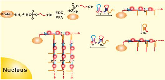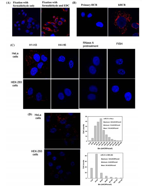 本研究针对传统检测方法在单细胞中miRNA原位成像灵敏度不足的问题,设计了一种基于原位杂交的bHCR-FISH技术用于肿瘤细胞原位检测miRNA。该技术采用了两项关键策略:一是通过共价键固定细胞内的miRNA;二是利用bHCR技术对目标miRNA信号进行放大处理,具体原理如图1所示。具体技术路线如下:1.通过多聚甲醛和EDC相结合来固定细胞中的miRNA,使蛋白质的氨基与miRNA的5'磷酸端不可逆的共价交联在一起,有效防止miRNA的损失;2.以固定的目标 miRNA为引发链与H1,H2发夹探针发生初级HCR反应在原位生成HCR聚合物;3.用封闭了的发夹探针H3与初级HCR聚合物侧链的延伸序列杂交引发二次HCR反应,产生在严格的杂交条件下具有高度聚合度的支化聚合物,从而增强了检测灵敏度;4.为了成像每个bHCR聚合物,我们对H1进行了标记TAMRA使得每个目标miRNA分子可被荧光显微镜可视化为荧光亮点。