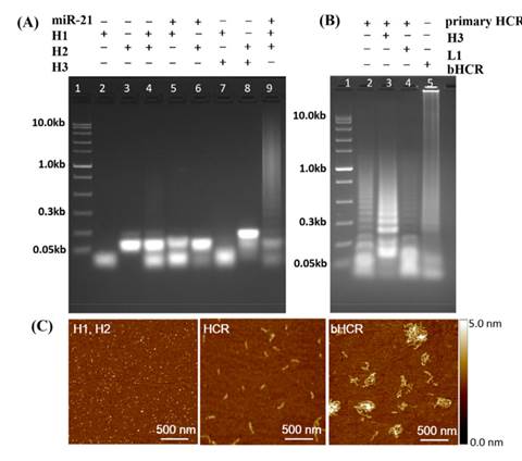 图2 扩增差异对比:常规条件HCR凝胶电泳分析(A);严格杂交条件下与bHCR凝胶电泳分析(B);原子力显微镜(AFM)成像展示严格荧光原位杂交(FISH)条件下的bHCR产物(C)