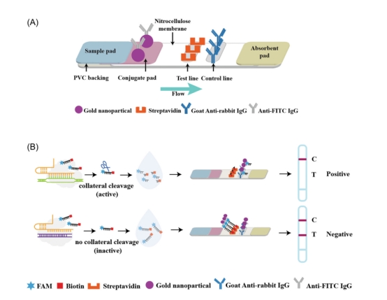 图2 CRISPR-Cas12a结合侧流层析检测示意图。(A) 侧流层析试纸条组装; (B) RPA/CRISPR-Cas12a/LFA检测原理