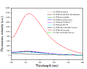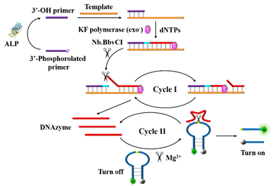 论文作者设计了一个在5’末端和3’末端分别修饰FAM基团和猝灭基团的分子信标探针,并在其环的部位修饰了一个RNA碱基,这个结构能被DNAzyme识别并切割。正常条件下在缓冲液中由于碱基互补相互作用,荧光基团和猝灭基团彼此相互靠近,荧光被猝灭。引物链的3’末端进行了磷酸化修饰,在正常条件下,聚合酶无法识别磷酸化位点,链置换扩增反应无法进行,无法生成DNAzyme,因此后续反应无法进行。在碱性磷酸酶存在下,引物链的3’端磷酸基团被水解,链置换扩增反应得以进行,生成大量DNAzyme并催化切割分子信标结构。分子信标结构在被切割后,荧光和猝灭基团将分开,荧光得以恢复,如图1所示。荧光信号的强弱与体系中碱性磷酸酶的浓度存在一定线性关系,可用于对碱性磷酸酶进行定量分析。