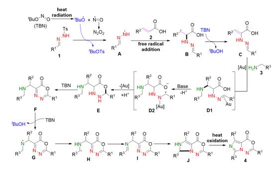 通过一系列对照实验和反应机理研究,研究团队发现,通过TBN的单电子转移(SET)氧化原位生成腙基自由基,随后与α,β-不饱和酸发生自由基加成,形成碳中心自由基,再经过一系列反应步骤,最终生成目标产物。此外,研究还证明了该反应的规模化潜力,为工业化生产提供了可能。