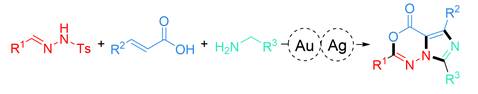 目前,通过涉及芳基碘化物、亚胺和一氧化碳的单步工艺,在开发过渡金属催化合成咪唑的方法方面取得了重大进展。此外,依赖传统环缩合技术的无过渡金属合成方法已成为有效的替代方案。尽管取得了较大进展,但一种新颖可控的咪唑和稠合咪唑发散合成策略仍然是具有挑战性的课题。姜博士团队开发了一种新颖高效的合成方法,通过金/银双催化、TBN作为氧化剂、DBU作为碱,利用N-甲苯磺酰腙与α,β-不饱和酸及胺的三组分多米诺环化反应,成功合成了一系列4H-咪唑-恶二嗪-4-酮。